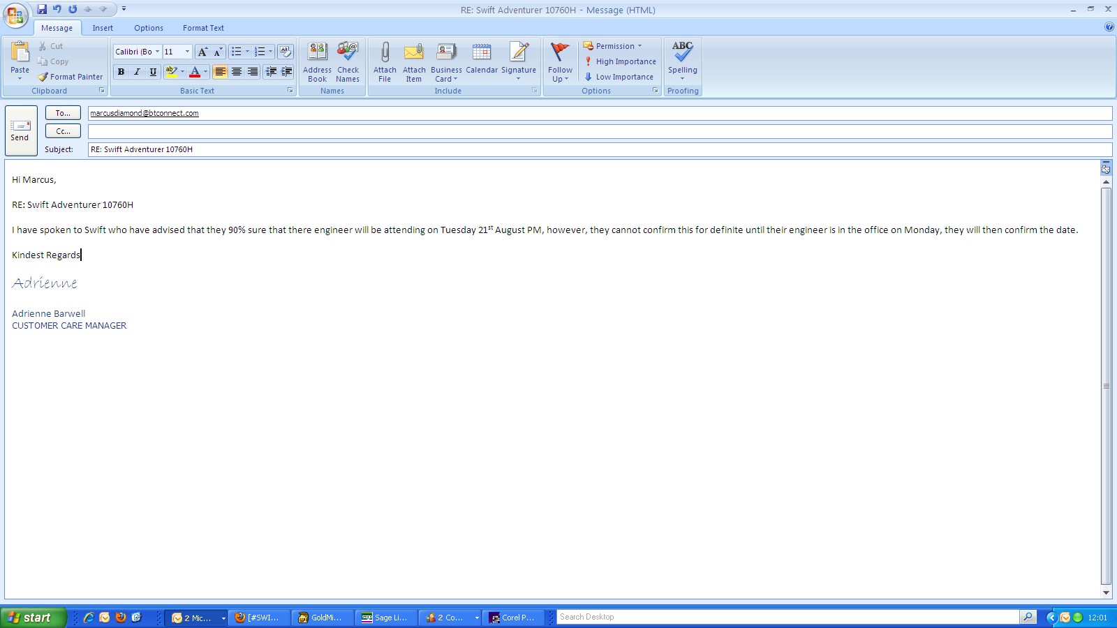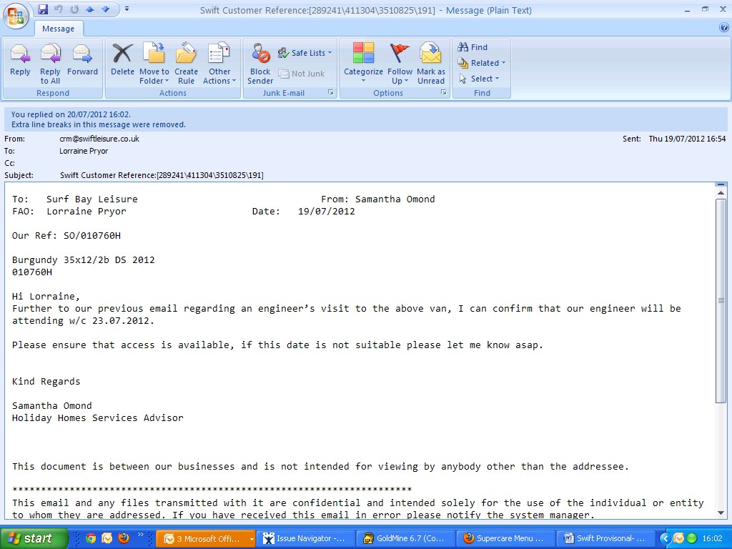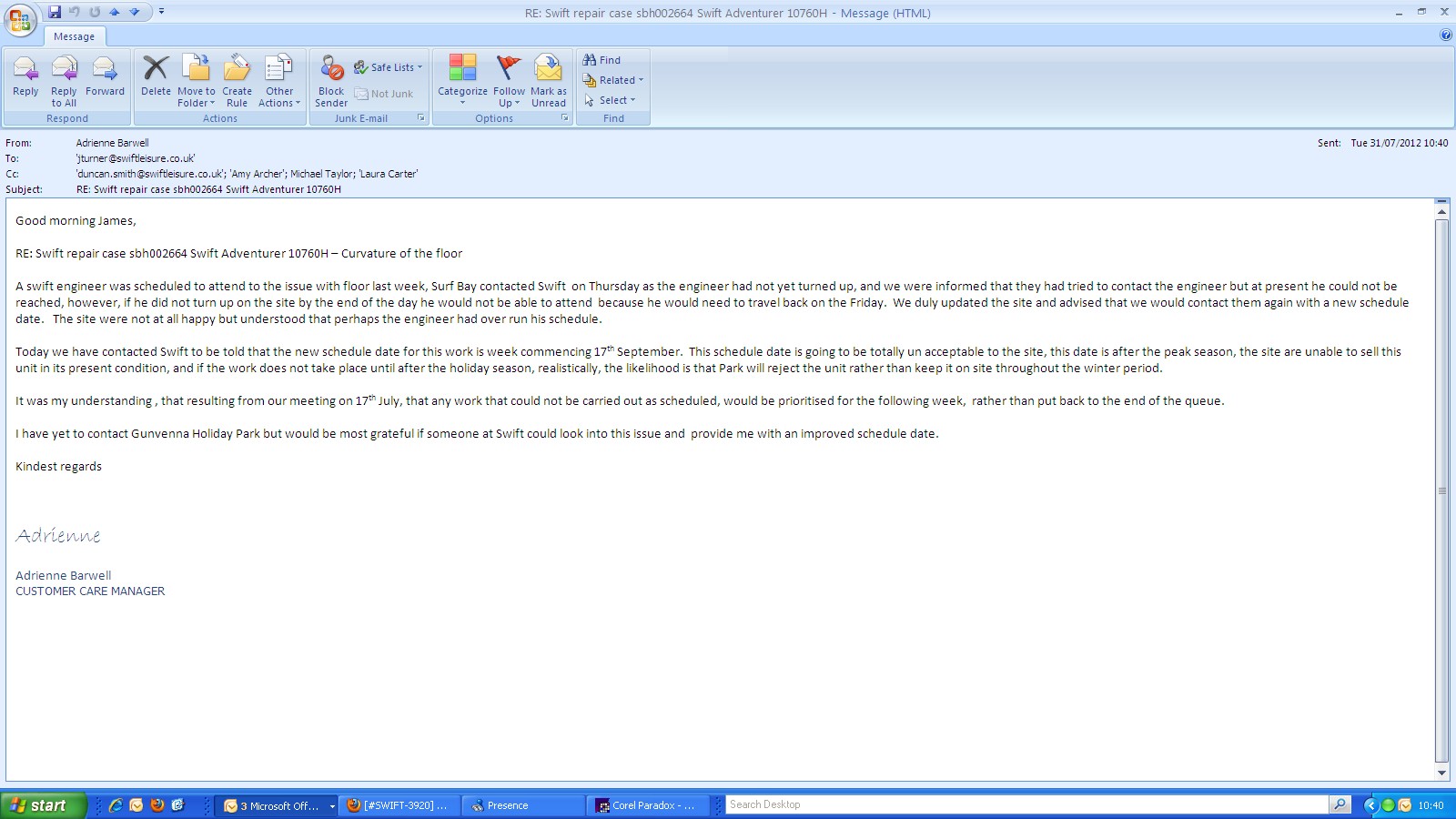 Swift have requested photographs - left a message for Steve on his mobile asking him to send through photographs