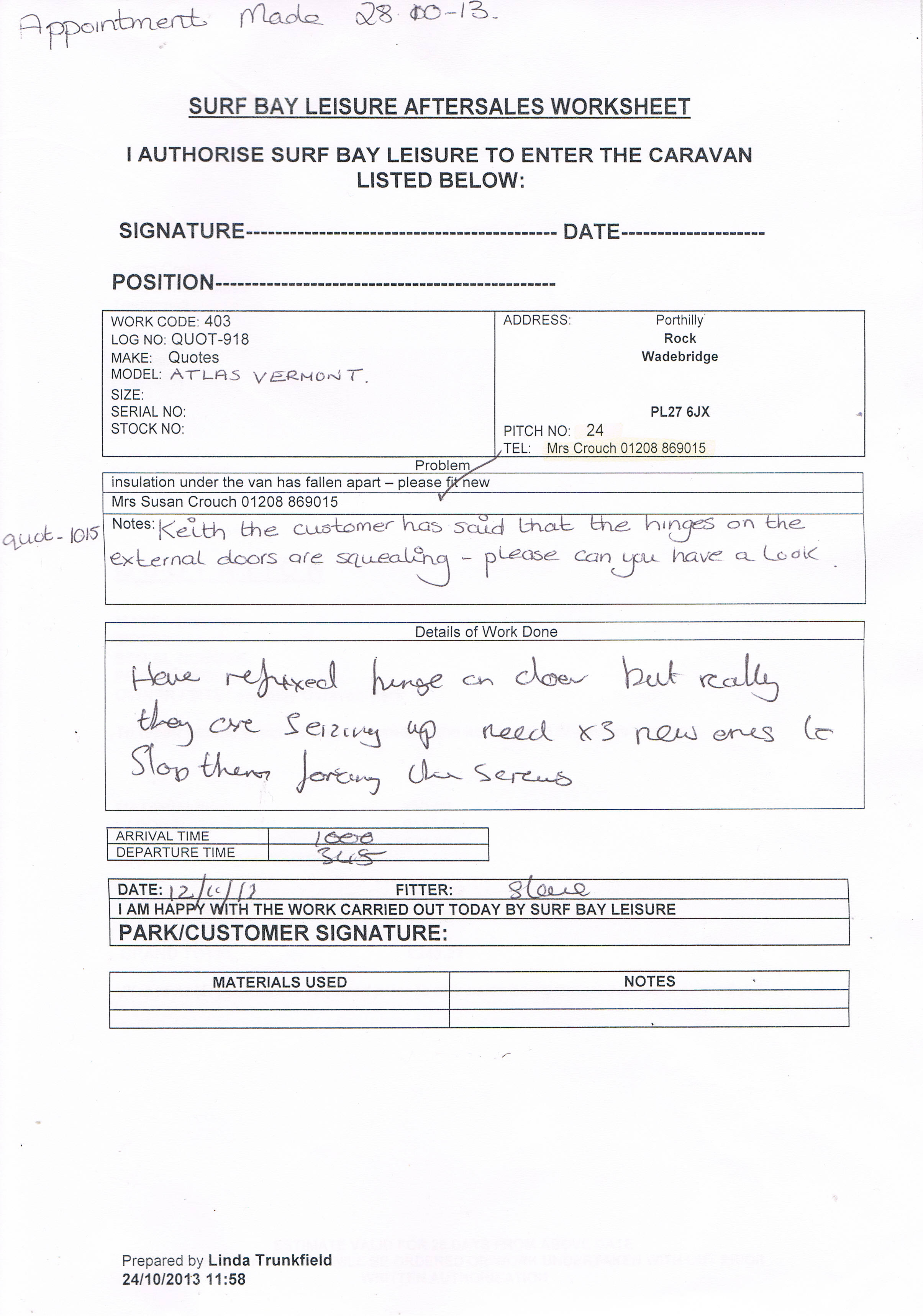 Swift have said that normally he would not authorise this but he will send us the parts and we do the repair, however I am unable to create the parts order as others issues on this claim are still on query