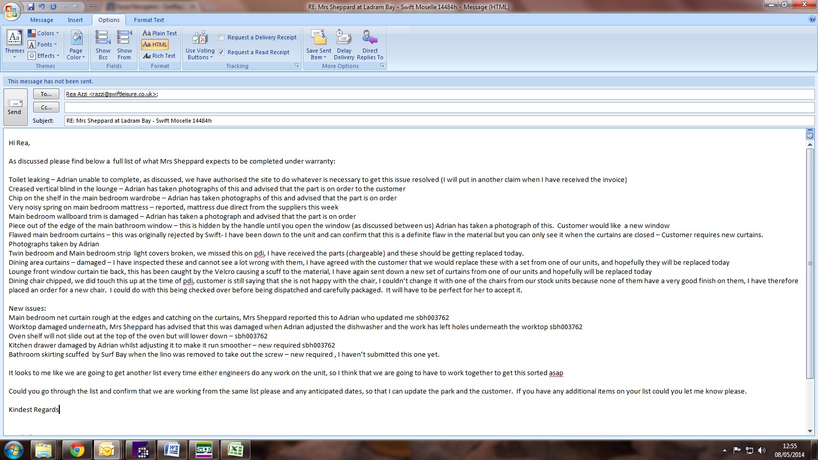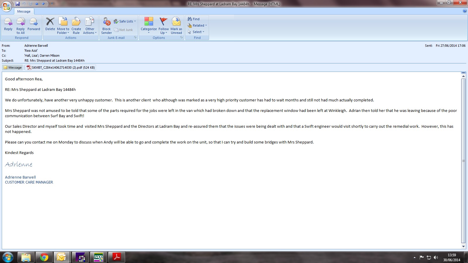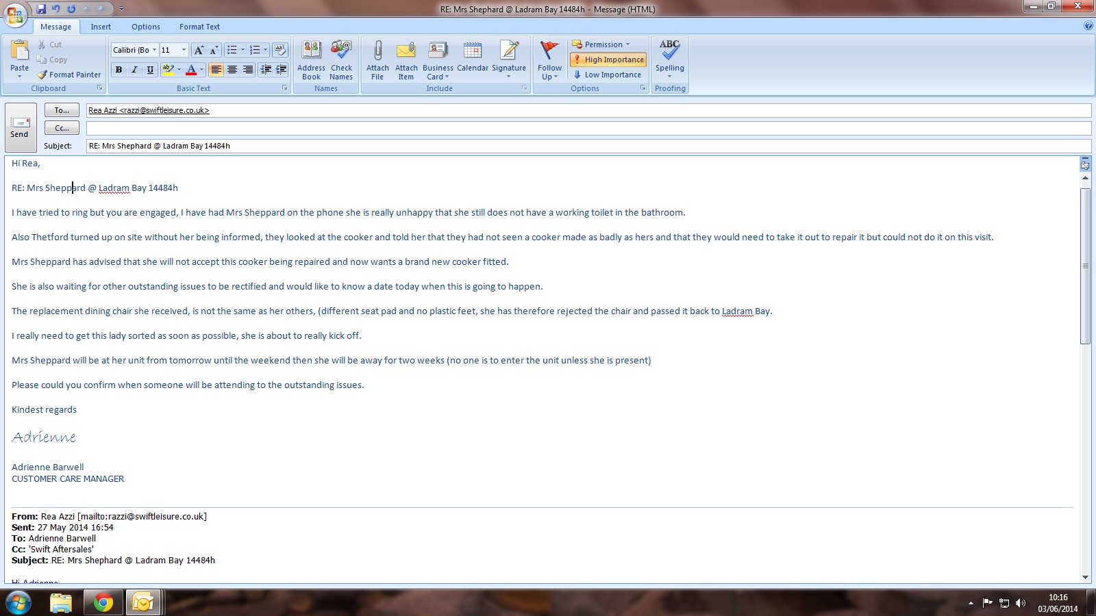 Adrienne Barwell (Inactive) added a comment - I have spoken to Mr Sheppard to advise that Swift are hoping to attend on Thursday and they will ring me tomorrow to confirm, Mr Sheppard said that this is fine and they will be on site on Thursday