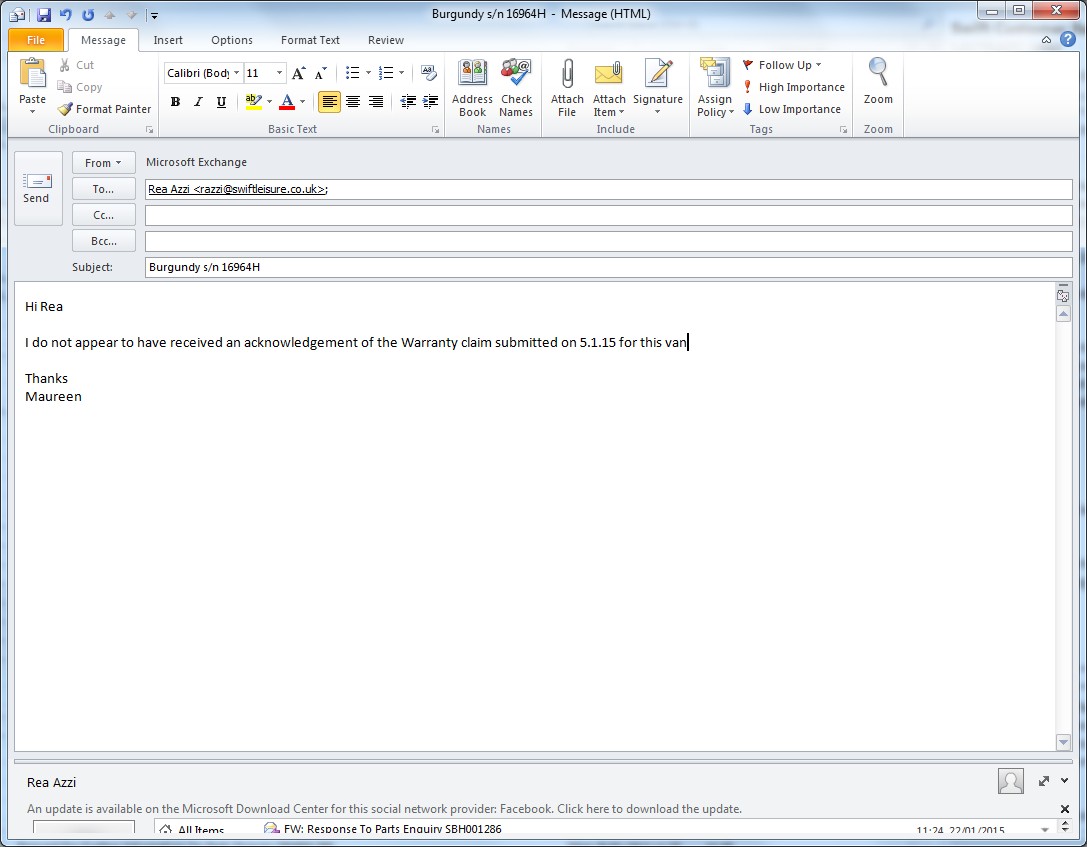 Email to Rea asking for an acknowledgment of this Warranty issue