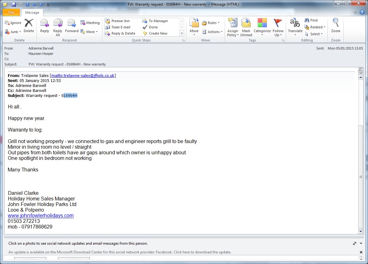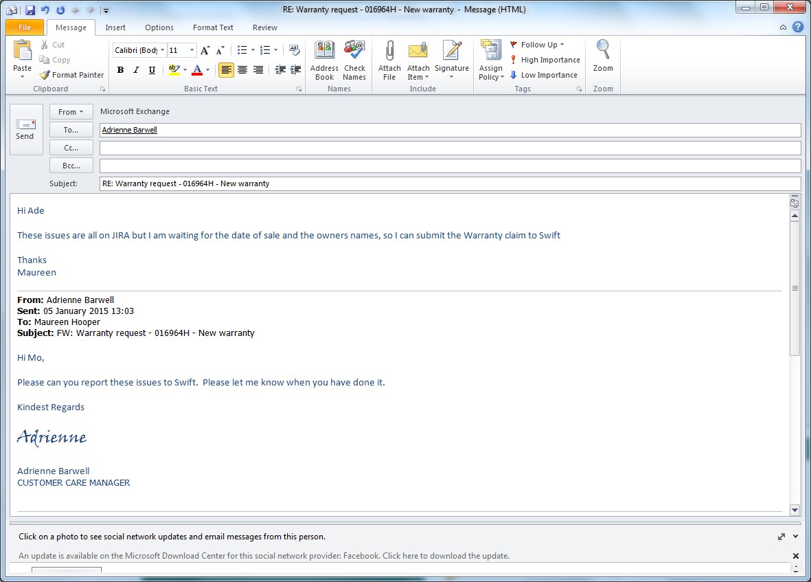 Email to Rea asking for an acknowledgment of this Warranty issue