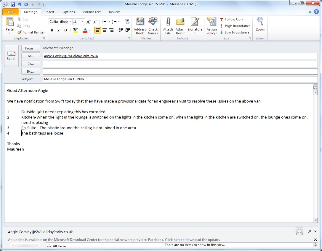 Email to site informing them of provisional date of engineers visit to resolve this issue