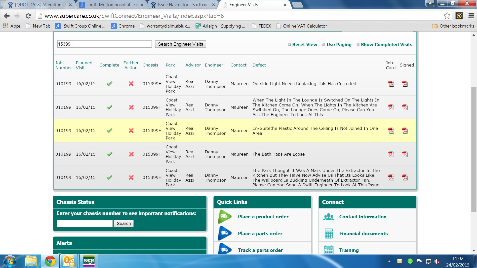 Lorraine Pryor (Inactive) added a comment - Angie has sent an email dated 06.01.15 to say that they report all of these issue back in October 14, I have checked on jira and nothing have ever been reported to us. Firstly paradox doesn't show that this was a demo van- delivered 21.03.14 to the site, need to know the date of sale/ owners name. I have emailed her back to say that I will report issue into Swift, but I need more information/ photos of some of the issue along. I need the DOS/ owner names as it needs to be commissioned on connect before I can submit these to swift