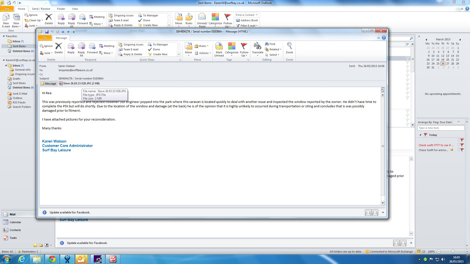 Email sent to Rea at Swift to reconsider warranty claim previously rejected and attached pictures.