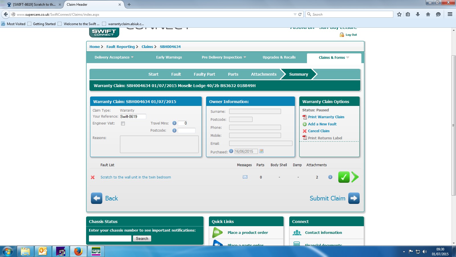Swift connect showing a schedule date of w/c 7/3/16