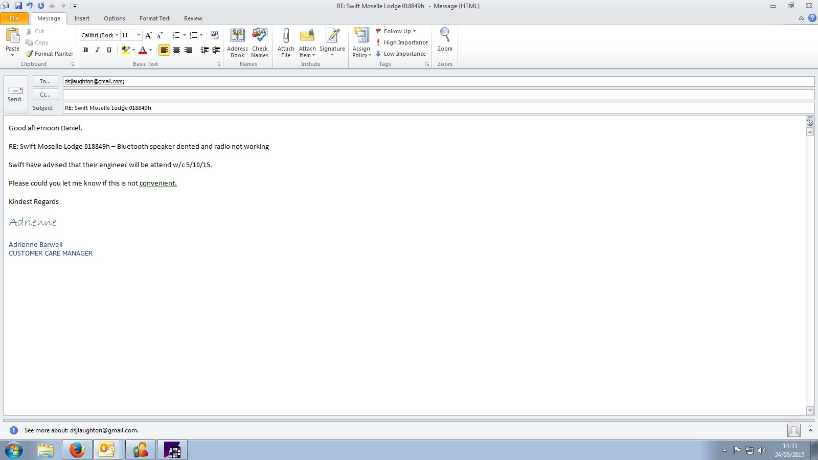 Swift advise engineer will attend w/c 19.10.15 - advised park accordingly.