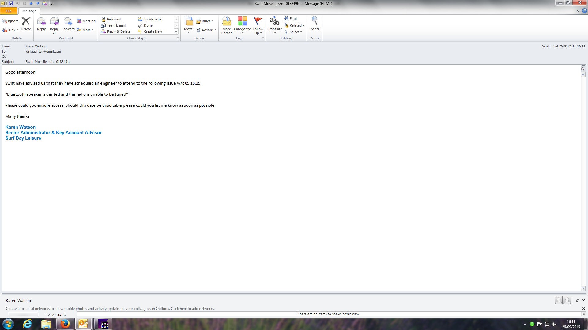 Karen Watson (Inactive) added a comment - Swift advise engineer will attend w/c 19.10.15 - advised park accordingly.