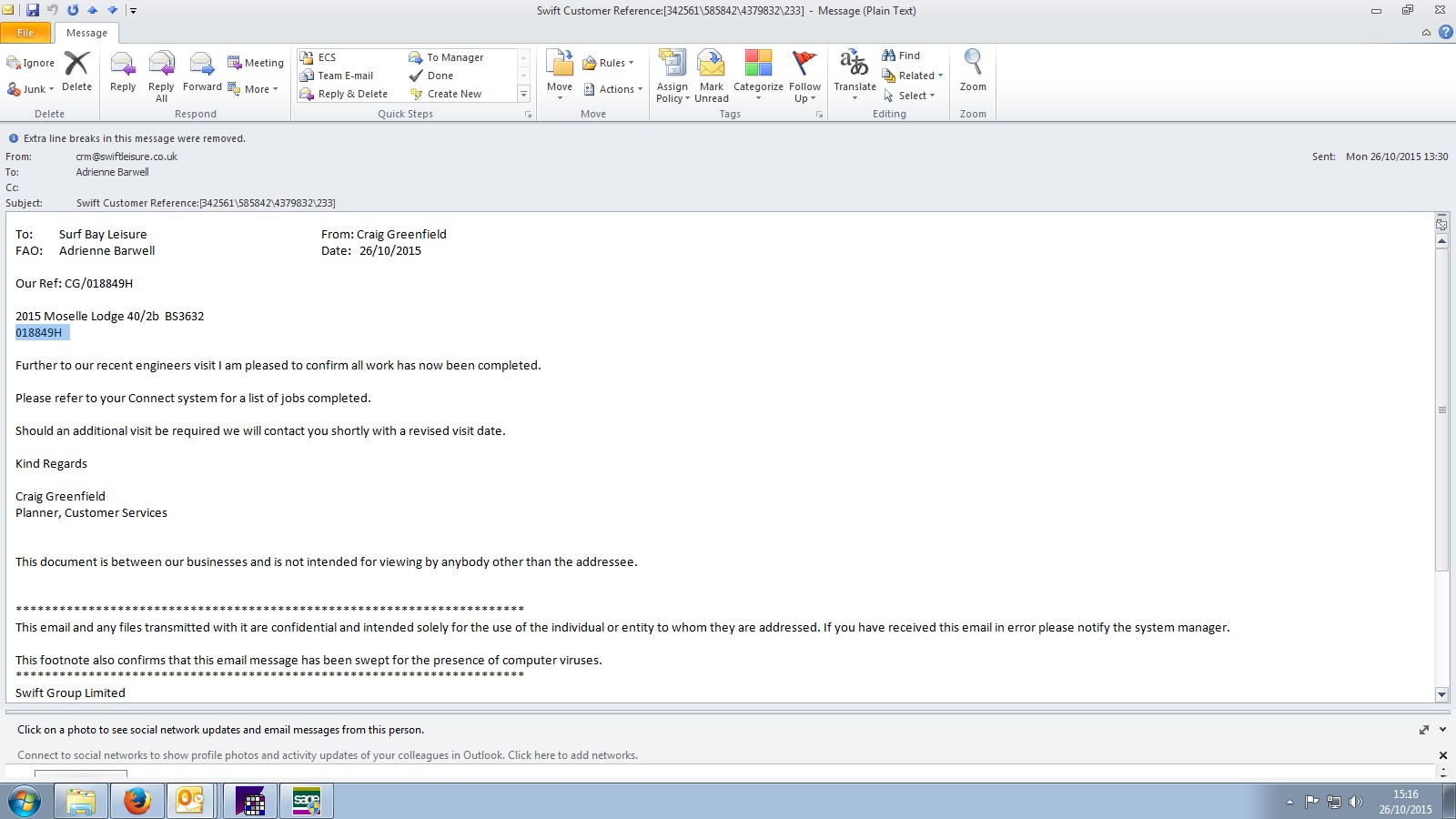 update from Swift advising that work is complete, however, this is not showing on the connect system yet. I will check again tomorrow