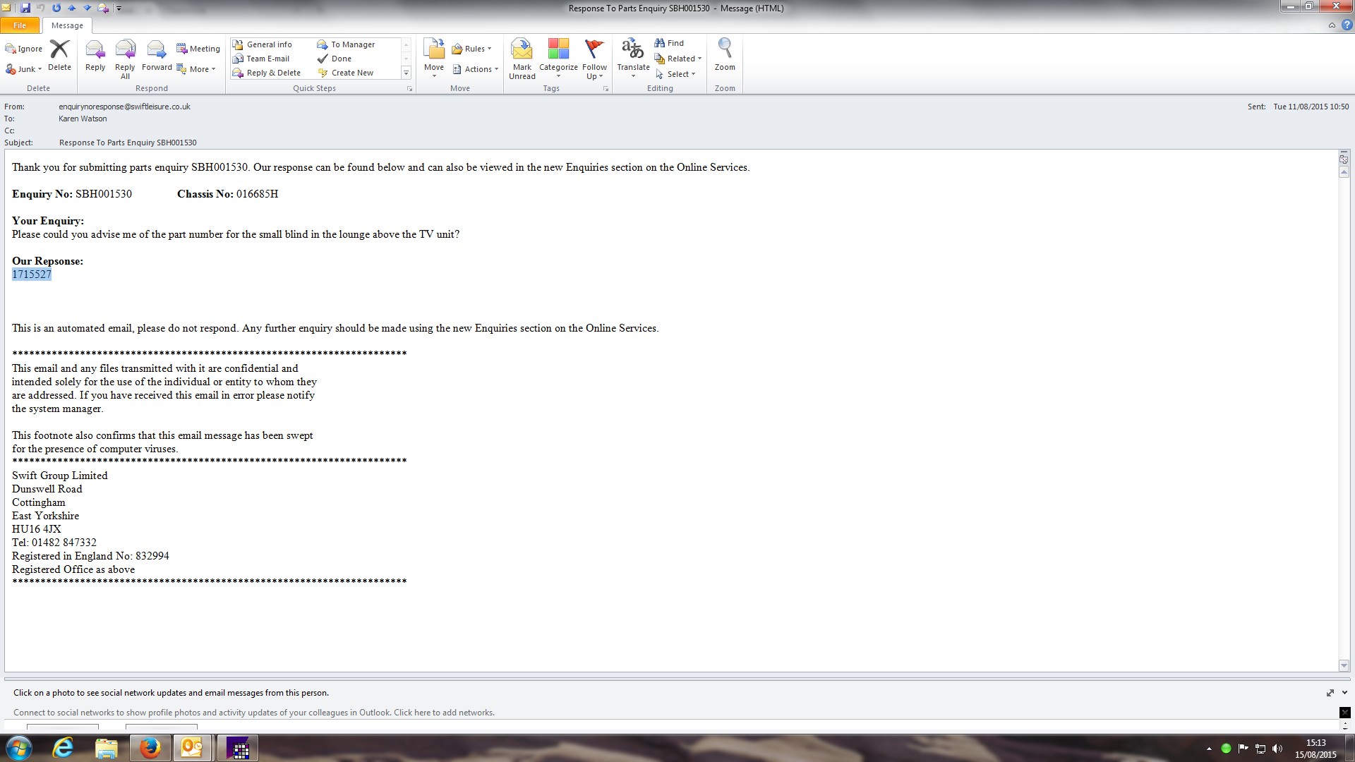 Entered into Swift Connect but paused waiting on reply to parts enquiry.