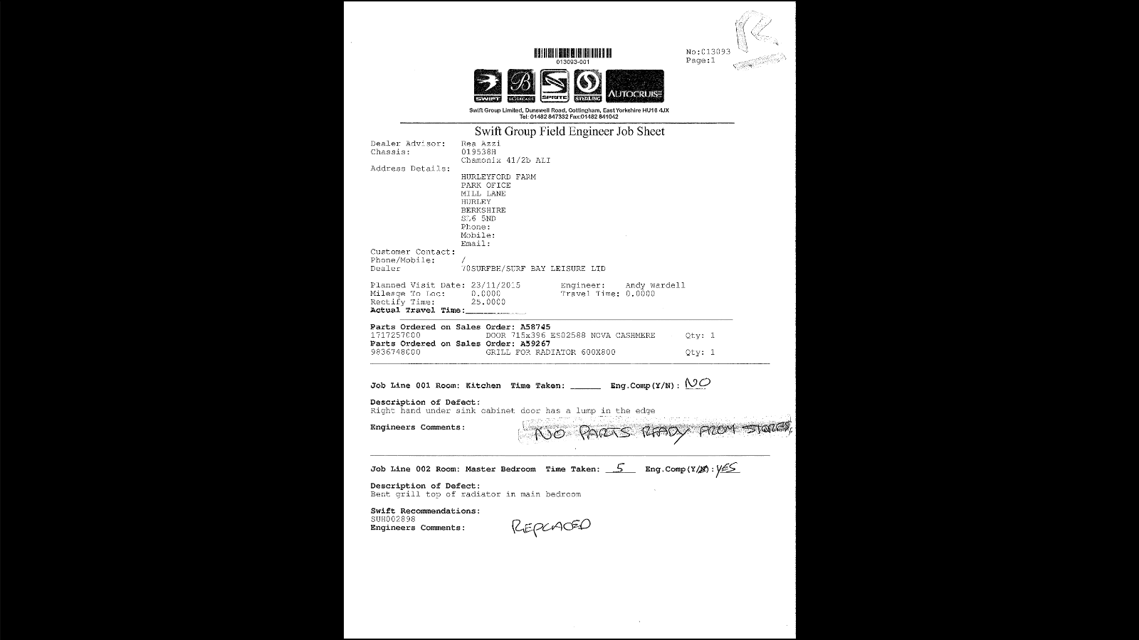 | Status | Engineer Scheduled [ 10000 ] | Parts on reorder [ 10009 ] |