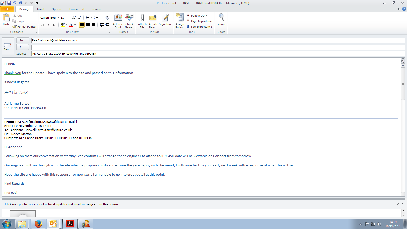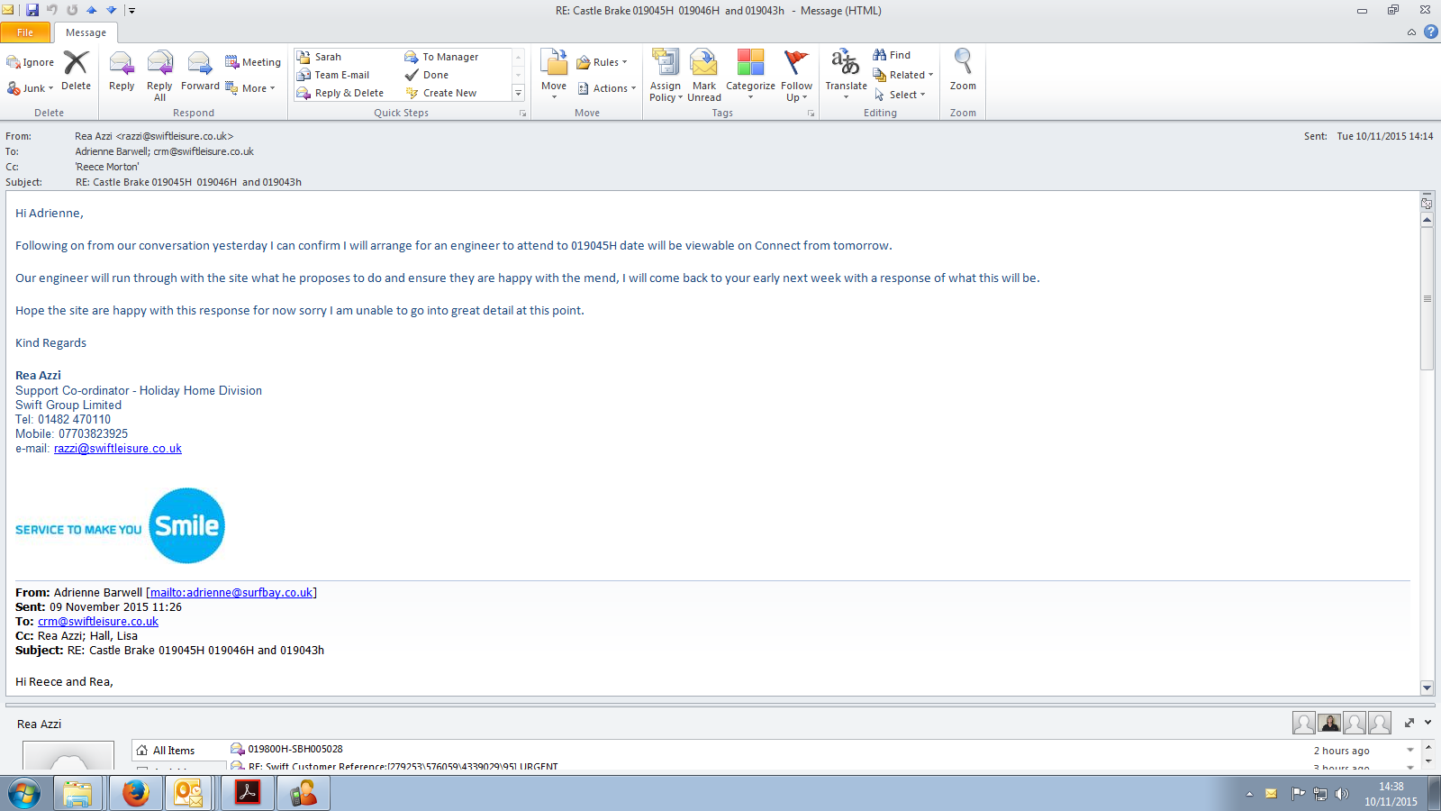 Adrienne Barwell (Inactive) added a comment - The swift engineer did not contact me today as agreed, I have phoned Andy (Swift) this afternoon to find out when he is attending, he has advised that he doesn't think that this is on his job list but he will check and call me on my mobile tomorrow. I will then give Amy a call