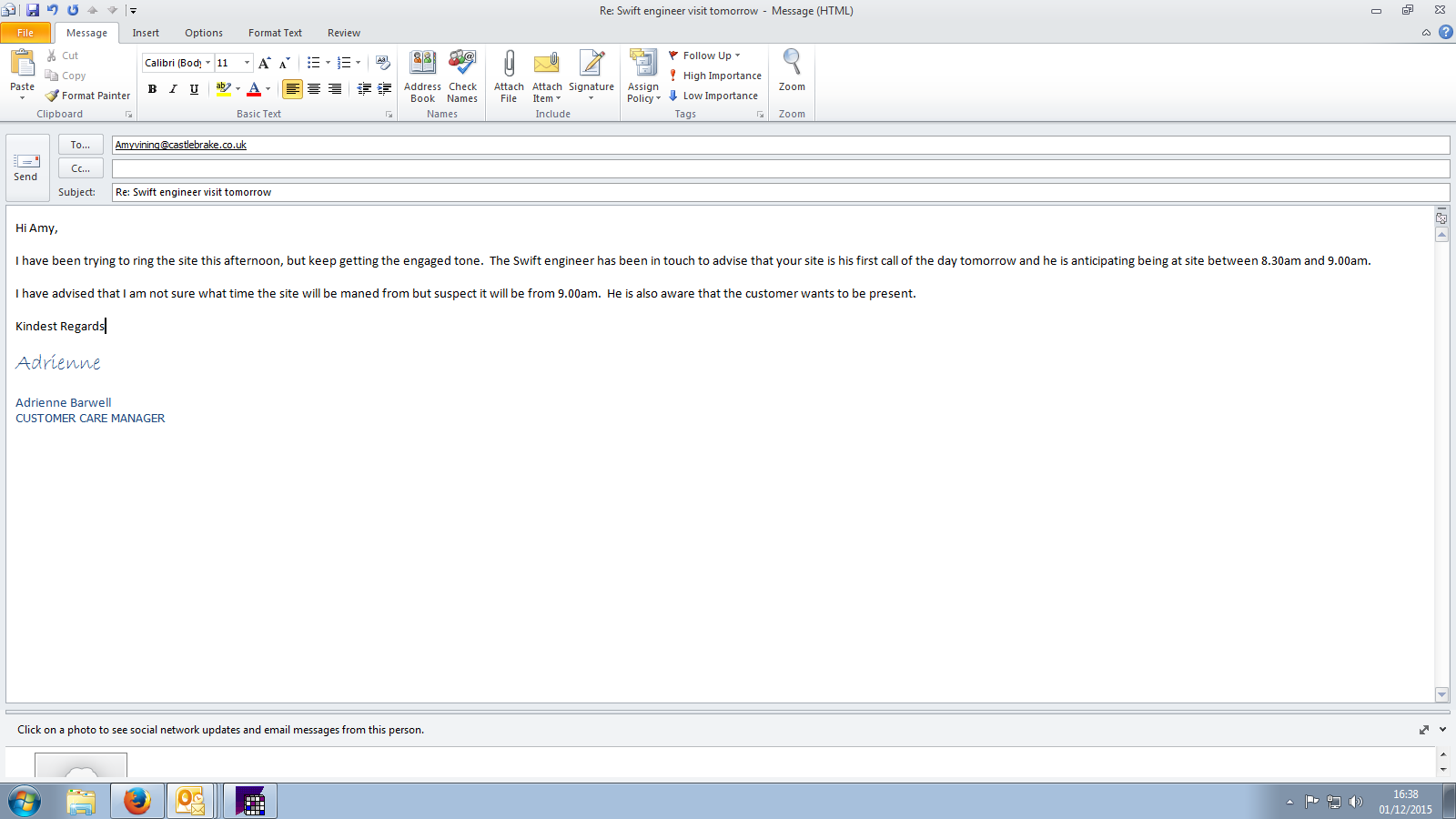 Adrienne Barwell (Inactive) added a comment - I have spoken to Andy who has confirmed that he will be attending next Wednesday - I have phoned Amy at Castle Brake and updated her. She will let the customer know
