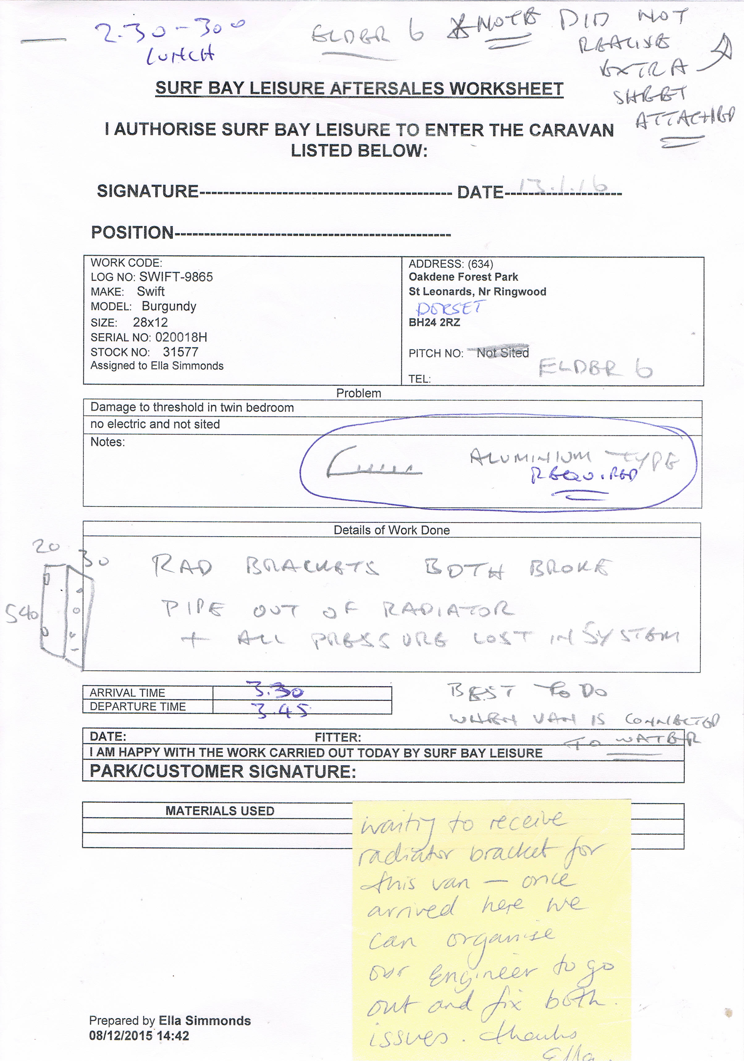 Recieved replacement radiator brackets, issued worksheet