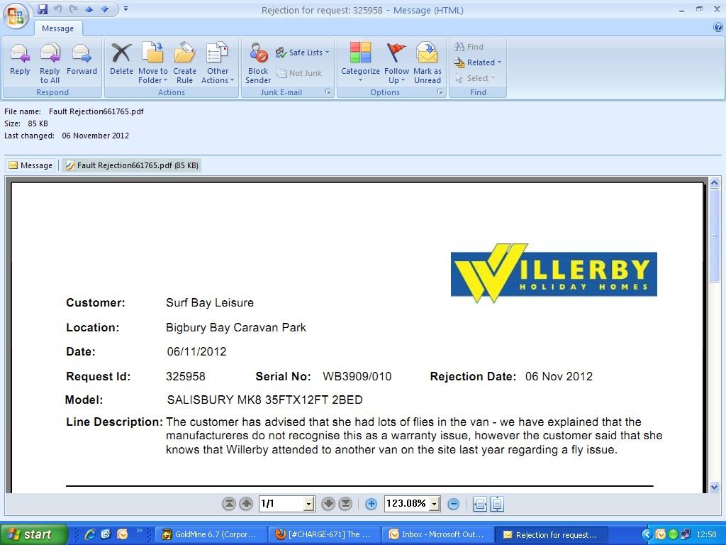 Linda Trunkfield (Inactive) added a comment - willerby have rejected this issue as not a manufacturing fault - I spoke to Mrs Sprague and she is not at all happy I gave her the number for John Reed who is the man I use when dealing with flies.