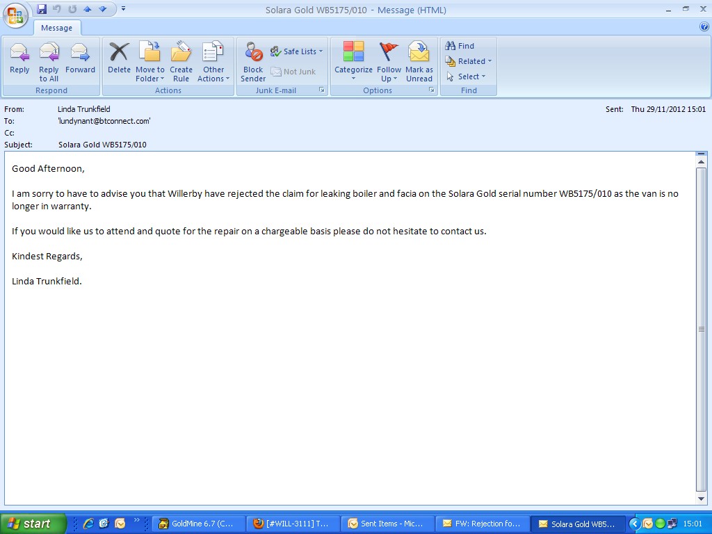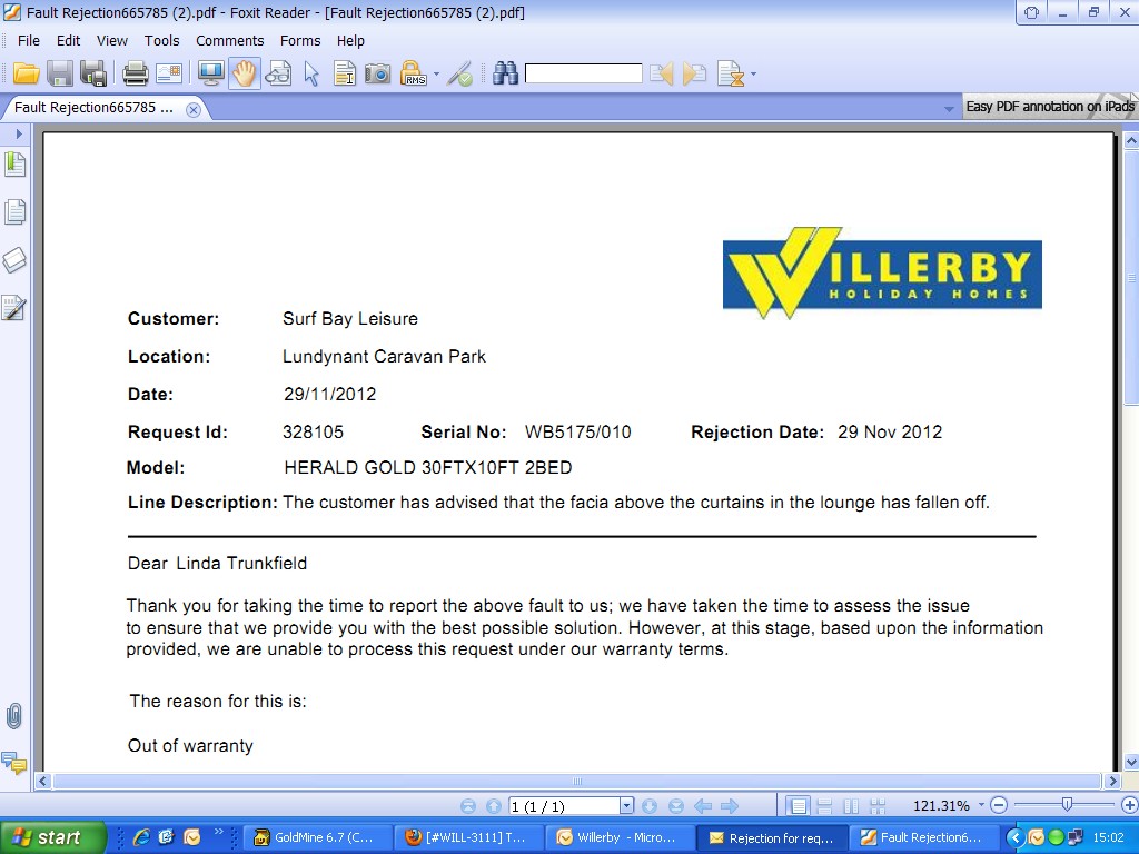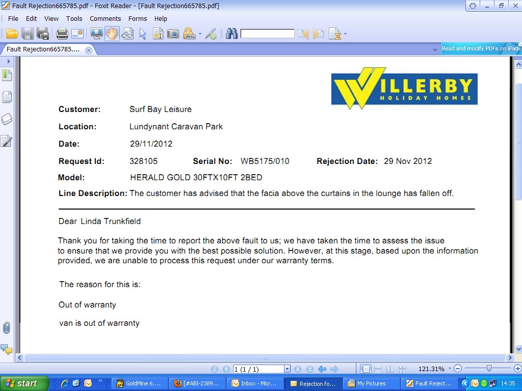 Willerby have rejected this issue as out of warranty.