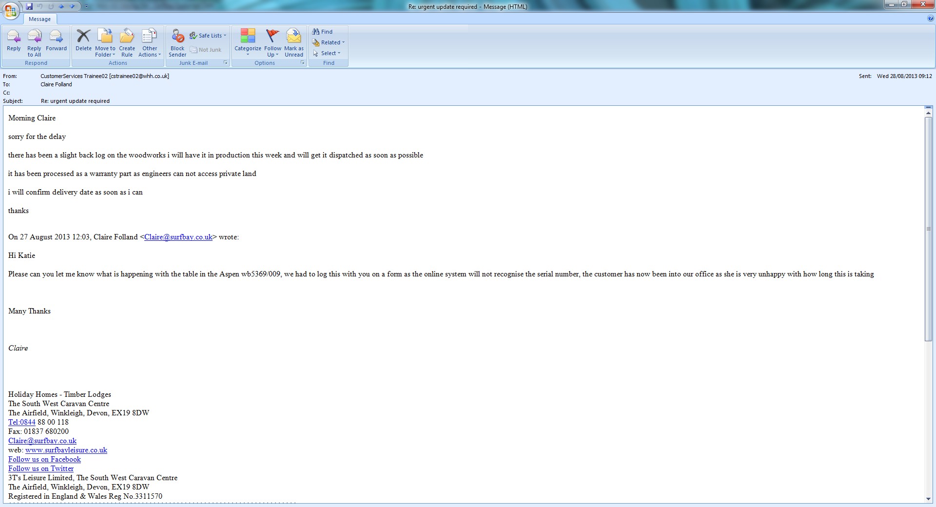 Mrs Manley came in she is most unhappy that she has not been updated about this situation - she wanted all the details of when this issue was logged and followed up so she could contact Willerby.