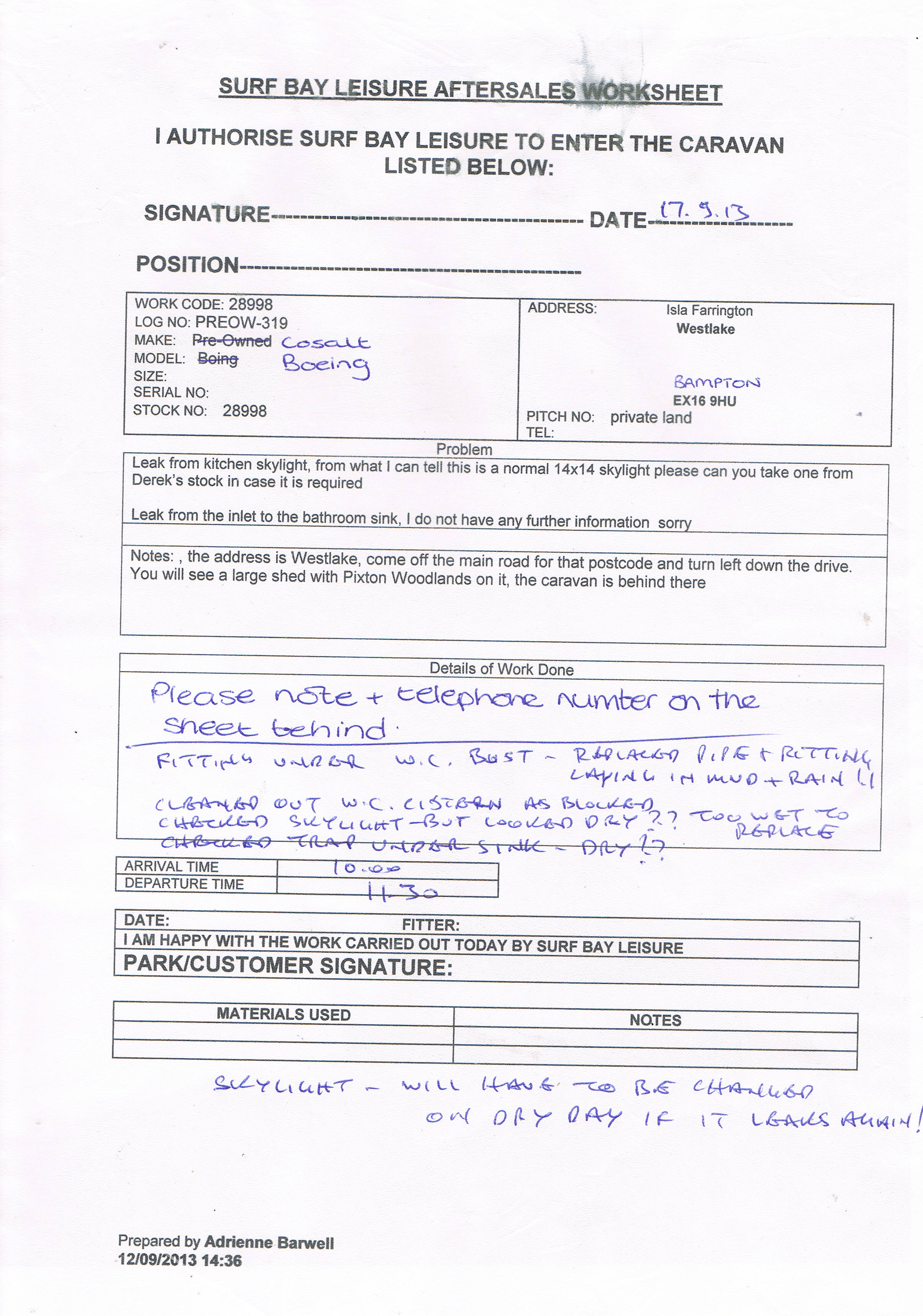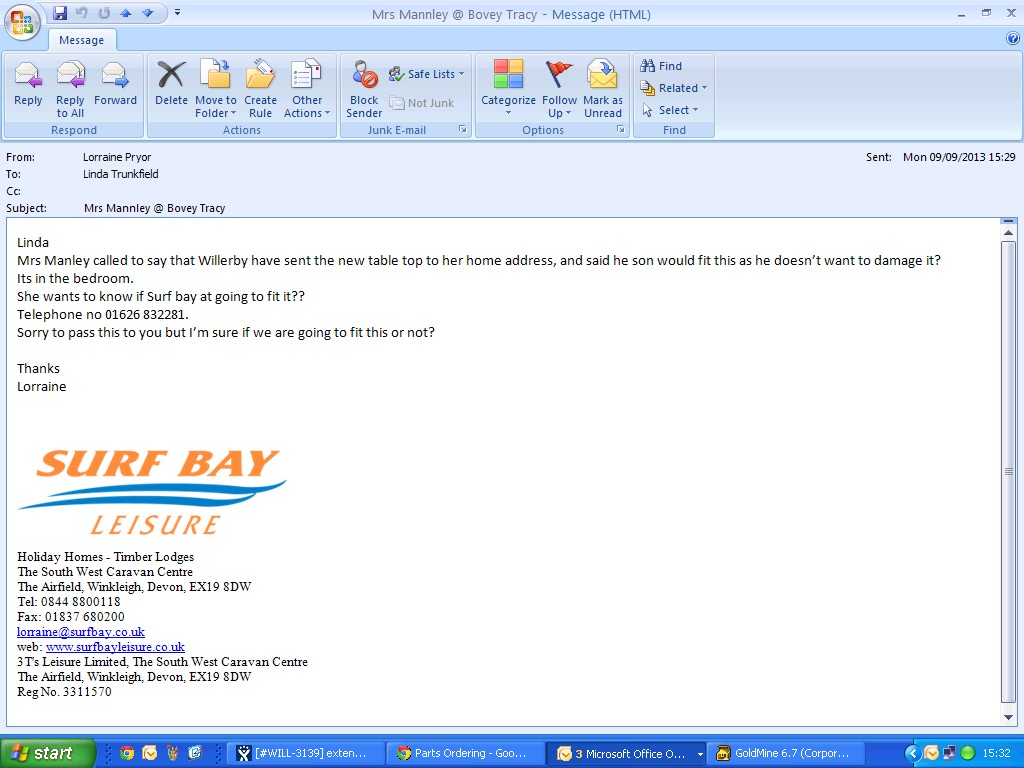 Lorraine Pryor (Inactive) added a comment - Mrs Manley called to say that the table was sent to her home address and that her son wont fit this he doesn't want to damage it. She has put it in the bedroom. I can see that Linda has been dealing with Mrs Manley, she want to know if Surf bay are fitting it or not. Jira states manufacture attending so not sure who is doing this one or if we are etc. I have e-mail Linda to ask her but it properly should be Claire. screen shot attached