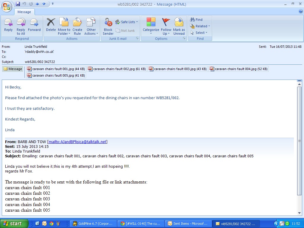 Linda Trunkfield (Inactive) added a comment - Becky called Claire and asked if we can get some photo's of the chairs I called Mr Fox and he is going to send some through via e-mail.