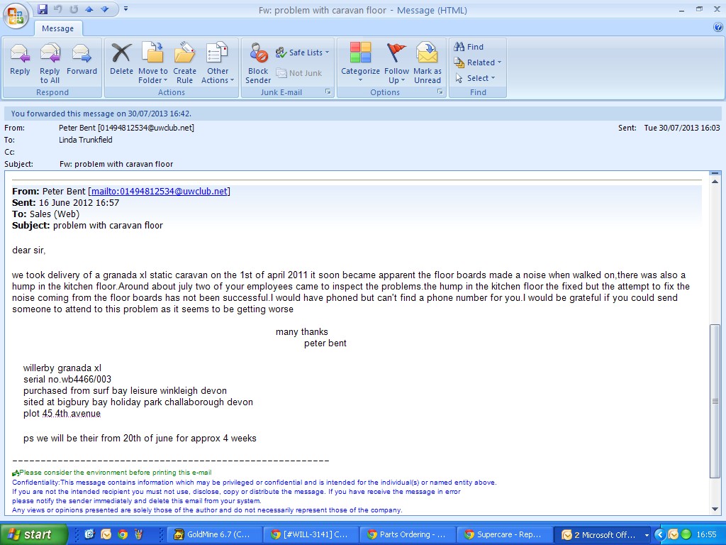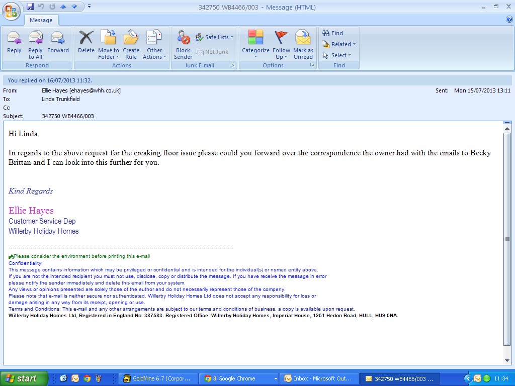 Mr Bent called to advise that a year ago he e-mailed Rebekah Britton with a complaint about squeeky floors, Rebekah advised Mr Bent that someone from Willerby customer care would contact him and they never have.
