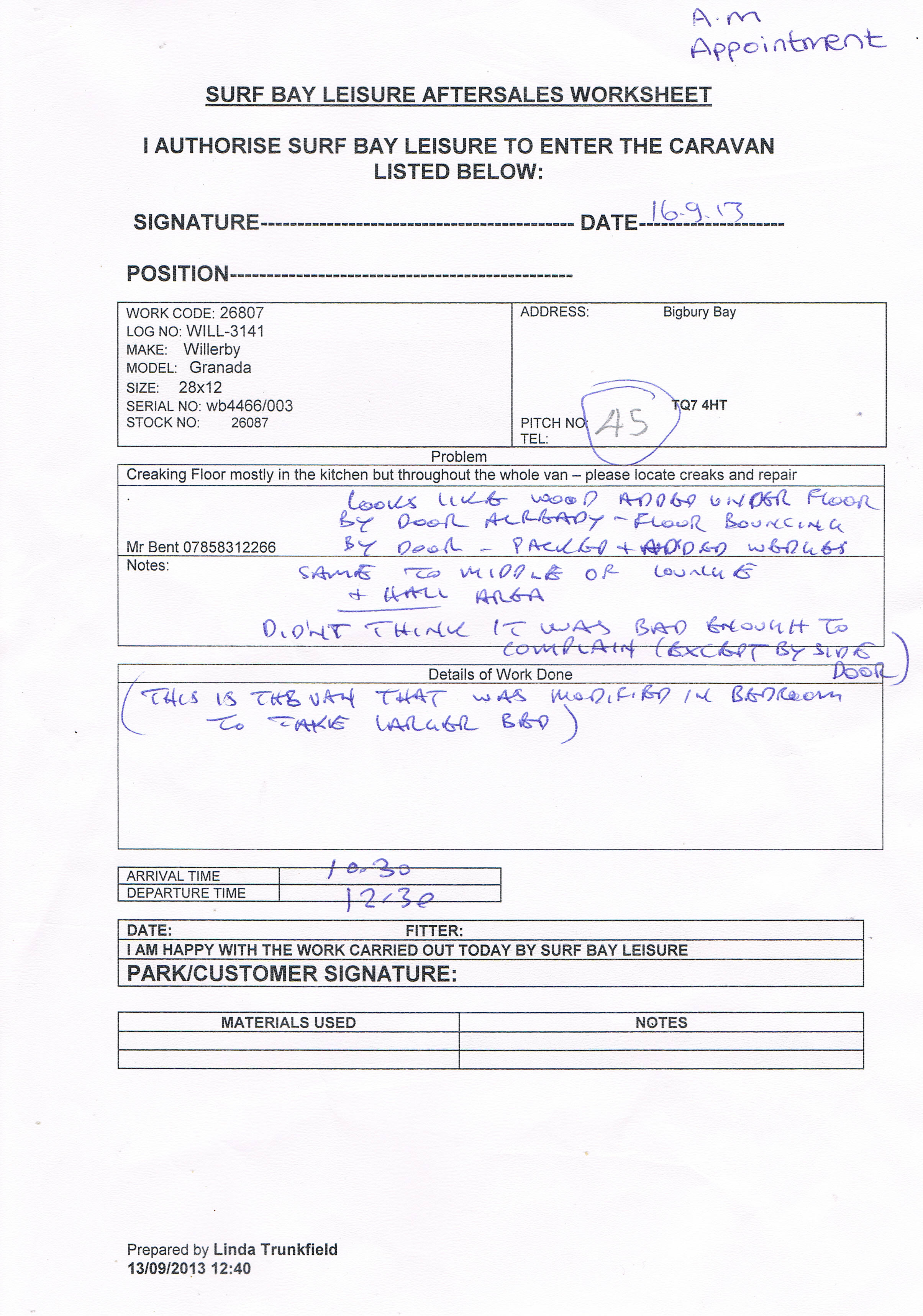 Mr Bent would like someone from Willerby to attend and look at his floors he said that it is creaking in the lounge but the kitchen area is more of a crackling sound - Mr Bent said that the floor had a hump in it where the flooring overlapped this was sorted out but the creaking was not.