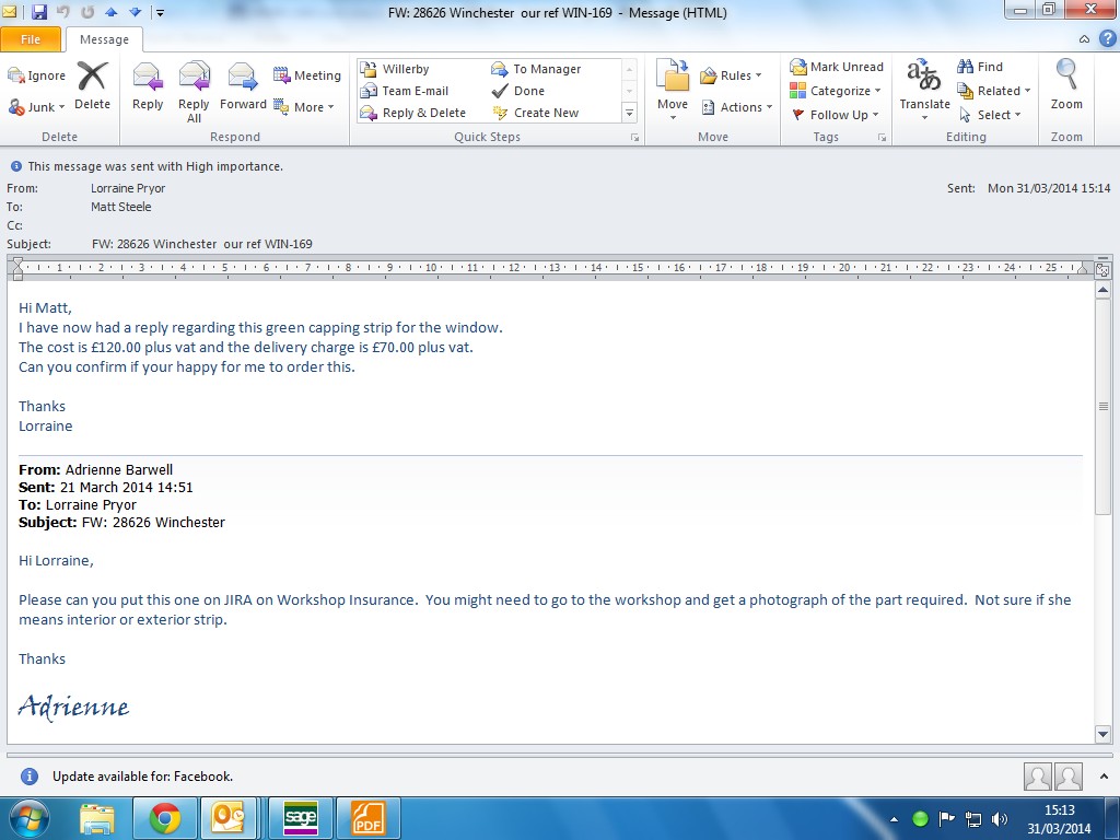 Lorraine Pryor (Inactive) added a comment - I have had the quote back for this green capping window strip, it £120 plus vat and delivery is £70.00 plus vat. Ive e-mail matt to let him know before I order it. Quote attached to jira and screen shot of e-mail to Matt.
