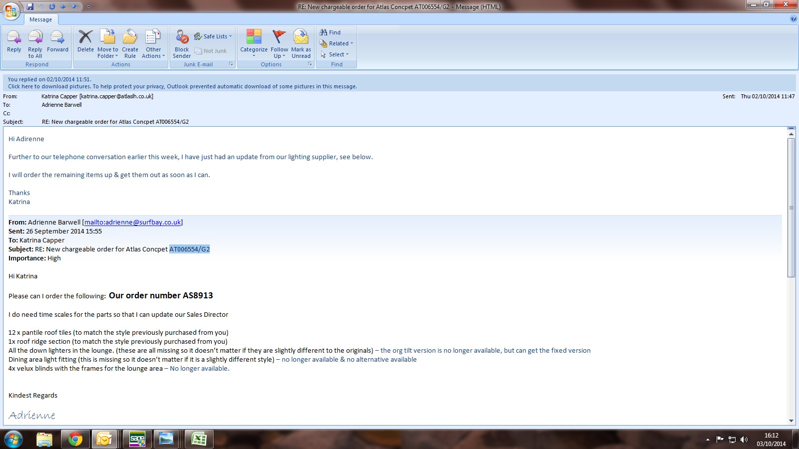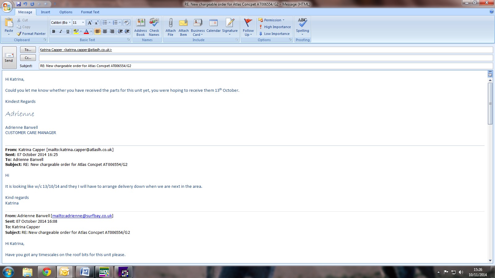 parts should be with Atlas w/c 13/10/14
