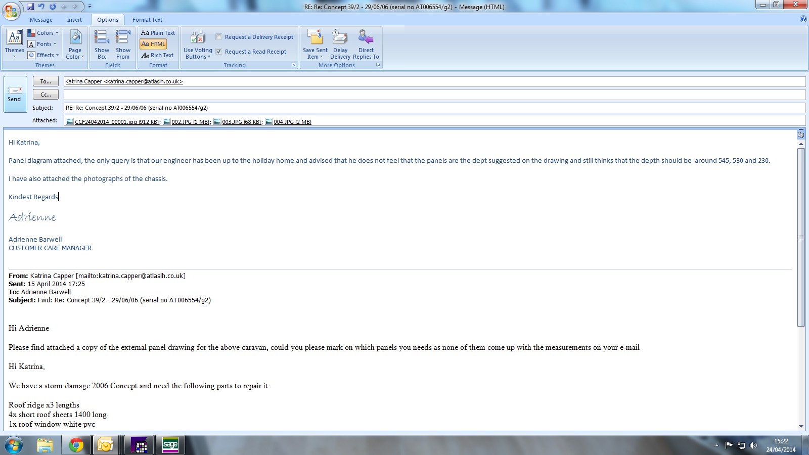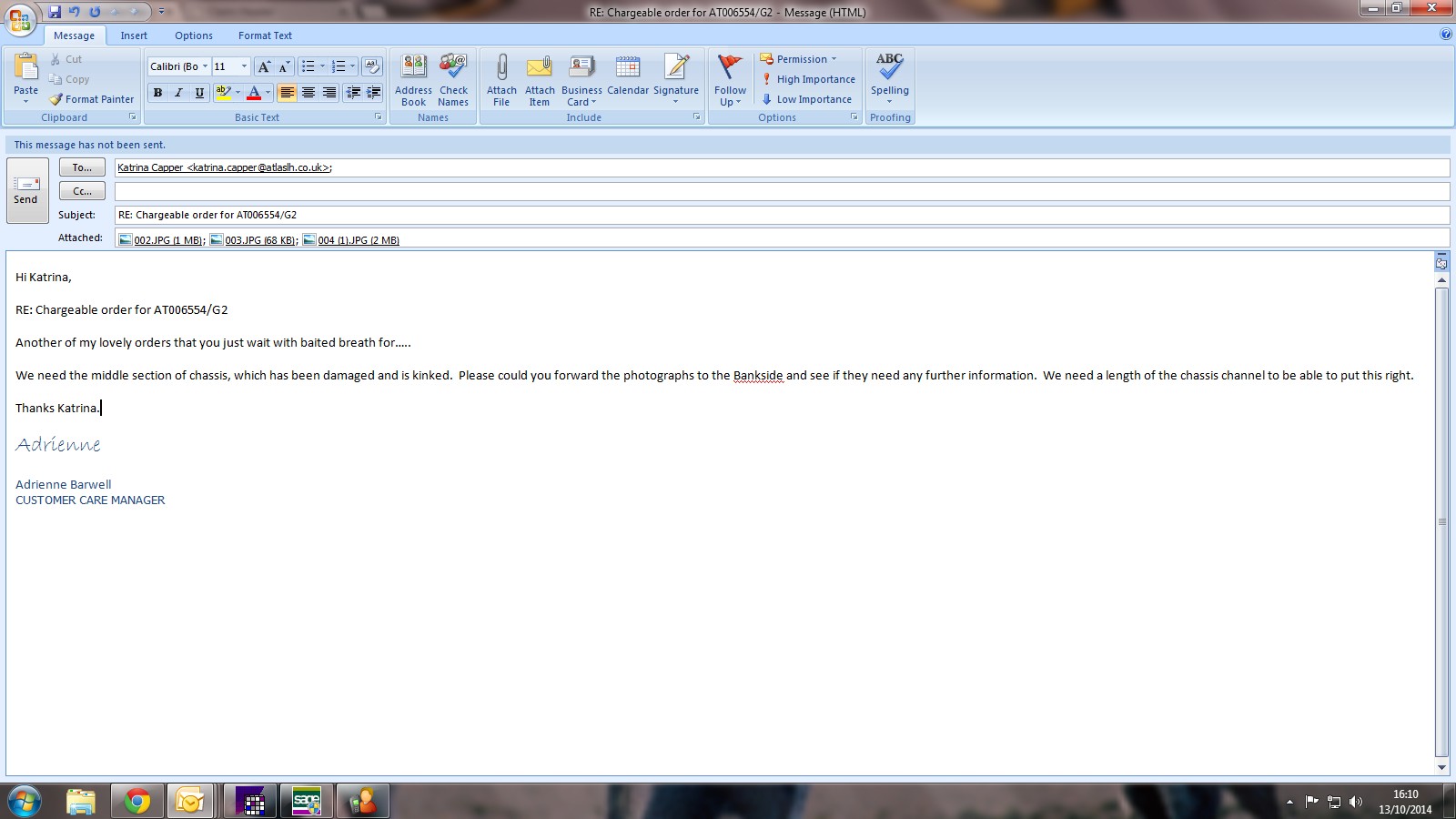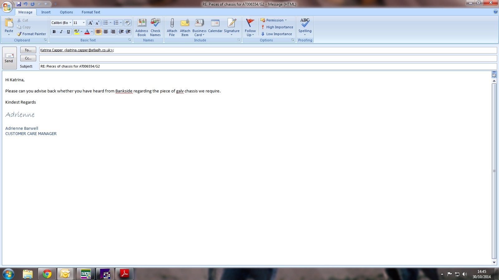 Adam says he needs a new piece for the chassis, I will need to see Bill to check what is required
